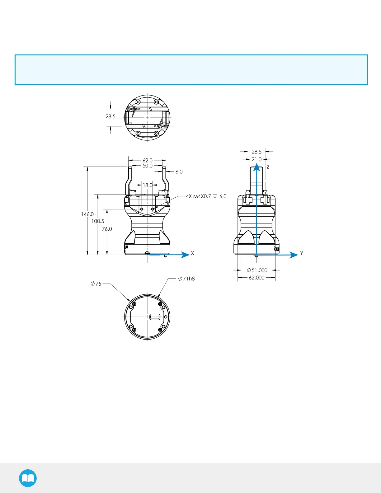 The figure below represents the Gripper's dimensions with axes X, Y, Z, and origin referenced for finger motion.
