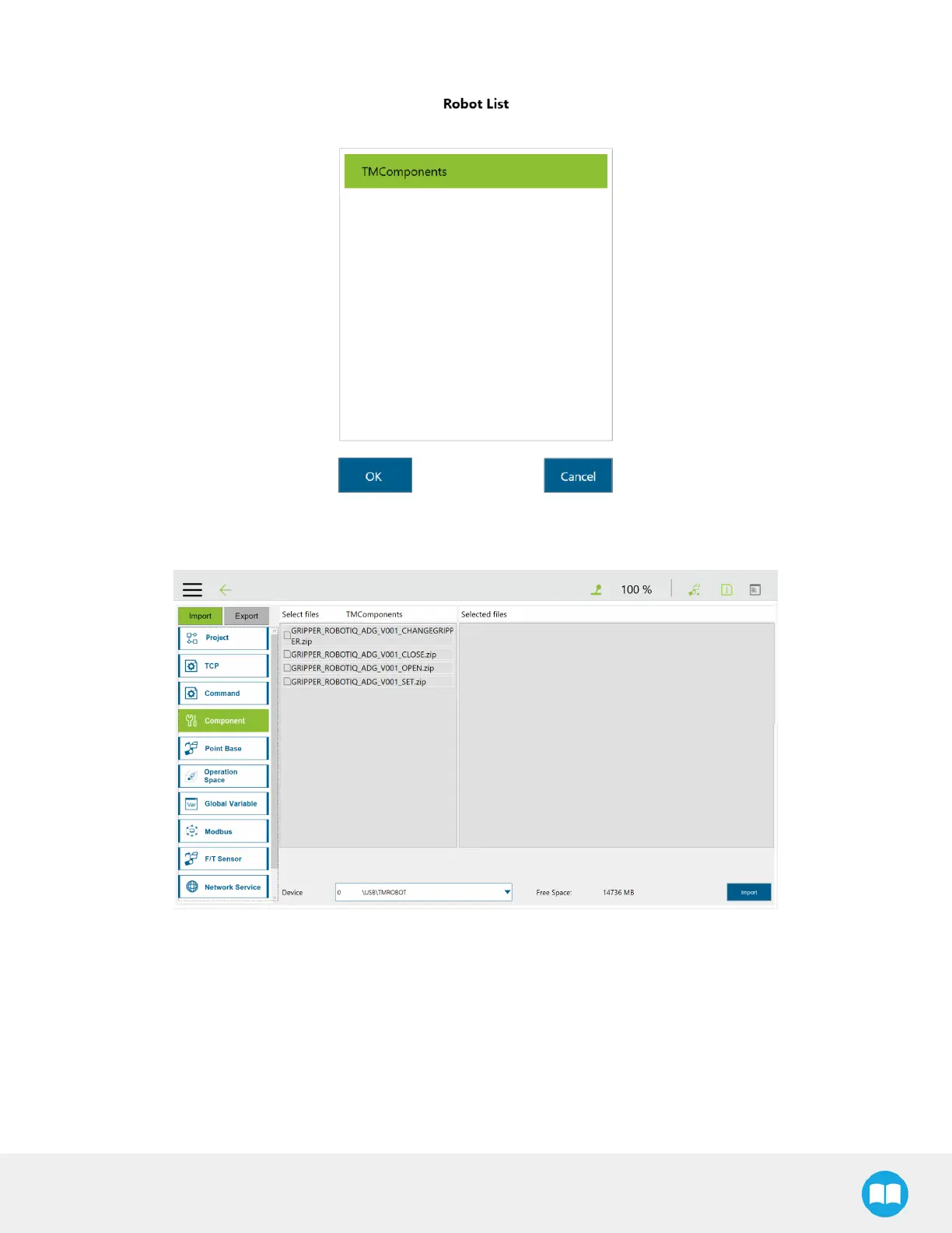 The "Robot List" window is displayed. Select TMComponents, then OK.
