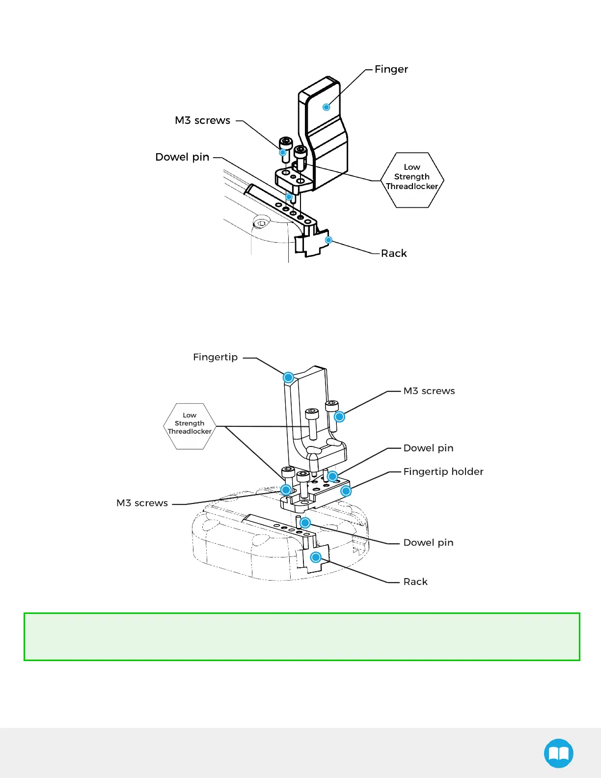 The user can install fingers directly on the racks, or fasten fingertips to fingertip holders, which are in turn installed on the racks. Refer to