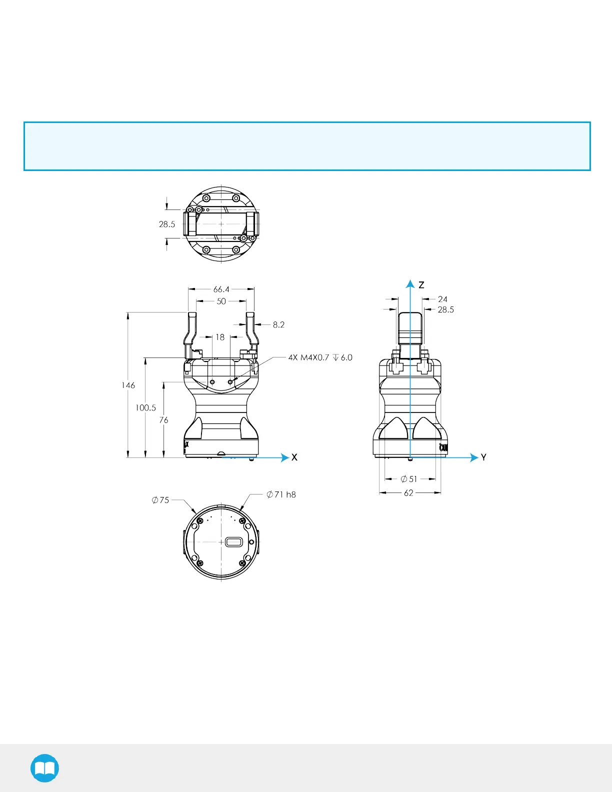 The figure below represents the gripper dimensions with axes X, Y, Z, and origin referenced for finger motion.