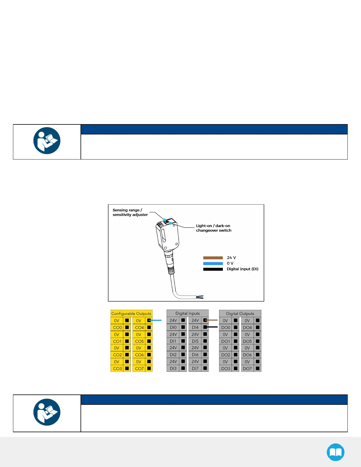 Connect the brown wire to a 24 Vterminal in a Digital Inputsblock