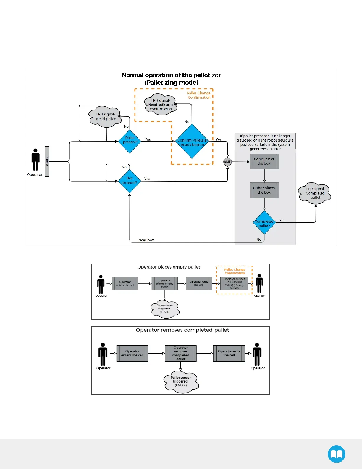 The following diagramsexplain the logic of the Palletizing Solution processbased on the operator's actions, as well as responses