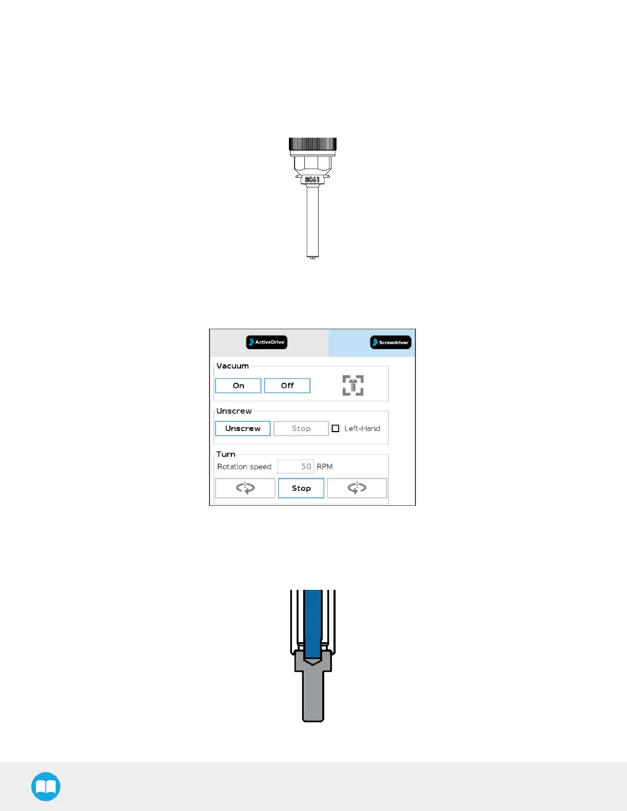 Fig. 4-4: Drawing of Screwdriving Bit (in Blue) Inserted Into Screw’s Drive with Screw Head Resting Against Vacuum Sleeve.