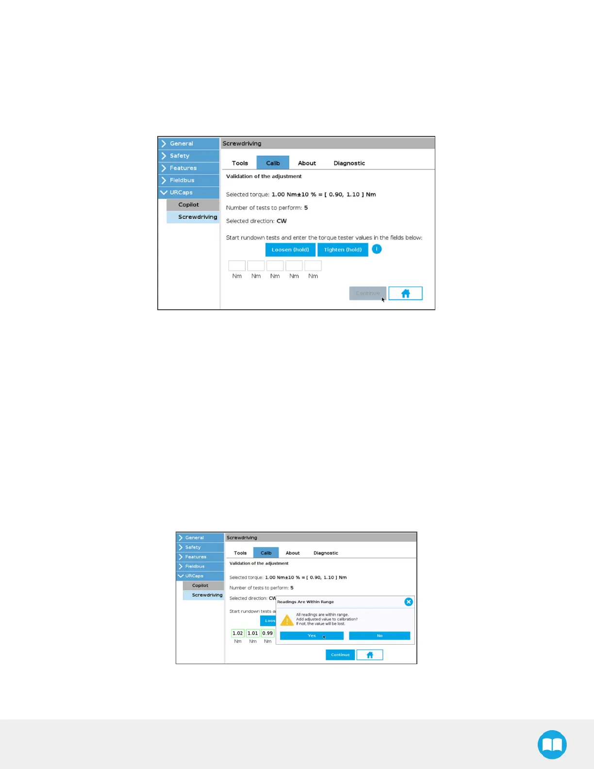 b. Hold the Tighten (hold) button until the popup window displays, indicating that the requested torque has