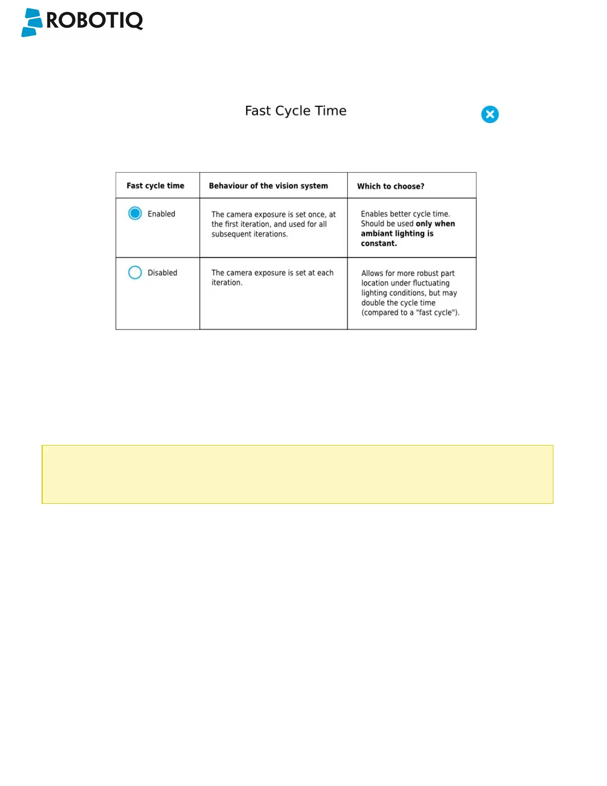 Enable the fast cycle time configuration only if the external ambient lighting is constant.