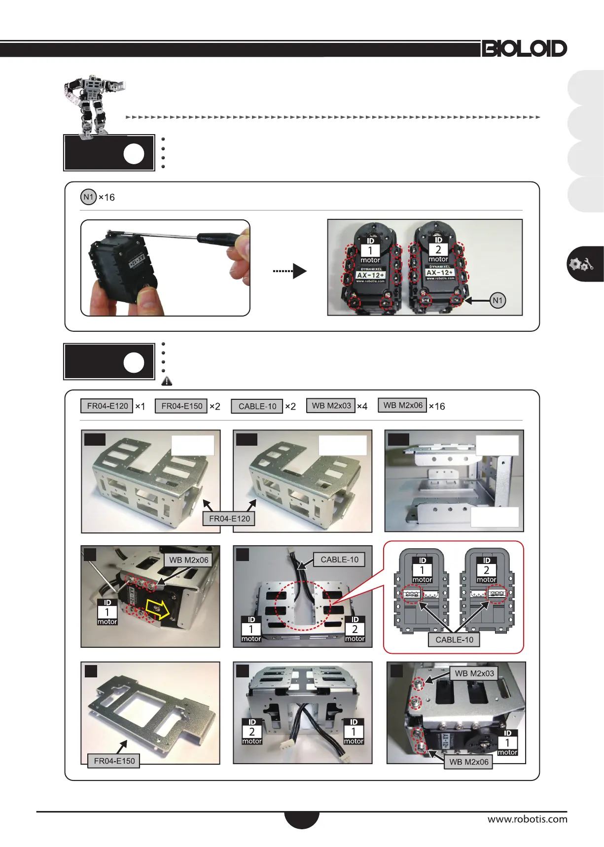 AX-12A ID1과 ID2에 CABLE-10을 연결하고 가슴프레임F(FR04-E120)와 체결한 후, 가슴프레임B(FR04-E150)와 체결한다.