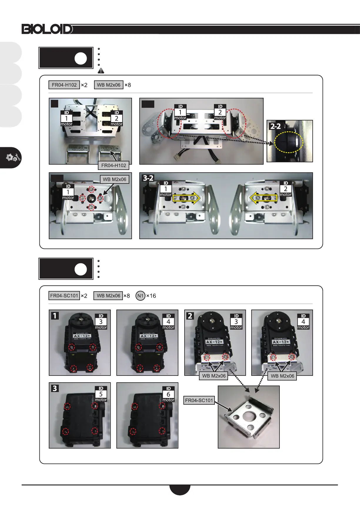 将螺母插入编号为ID3和ID4的AX-12A中,然后将它们连接到FR04-SC101连接件上。在ID5和ID6中插入螺母。