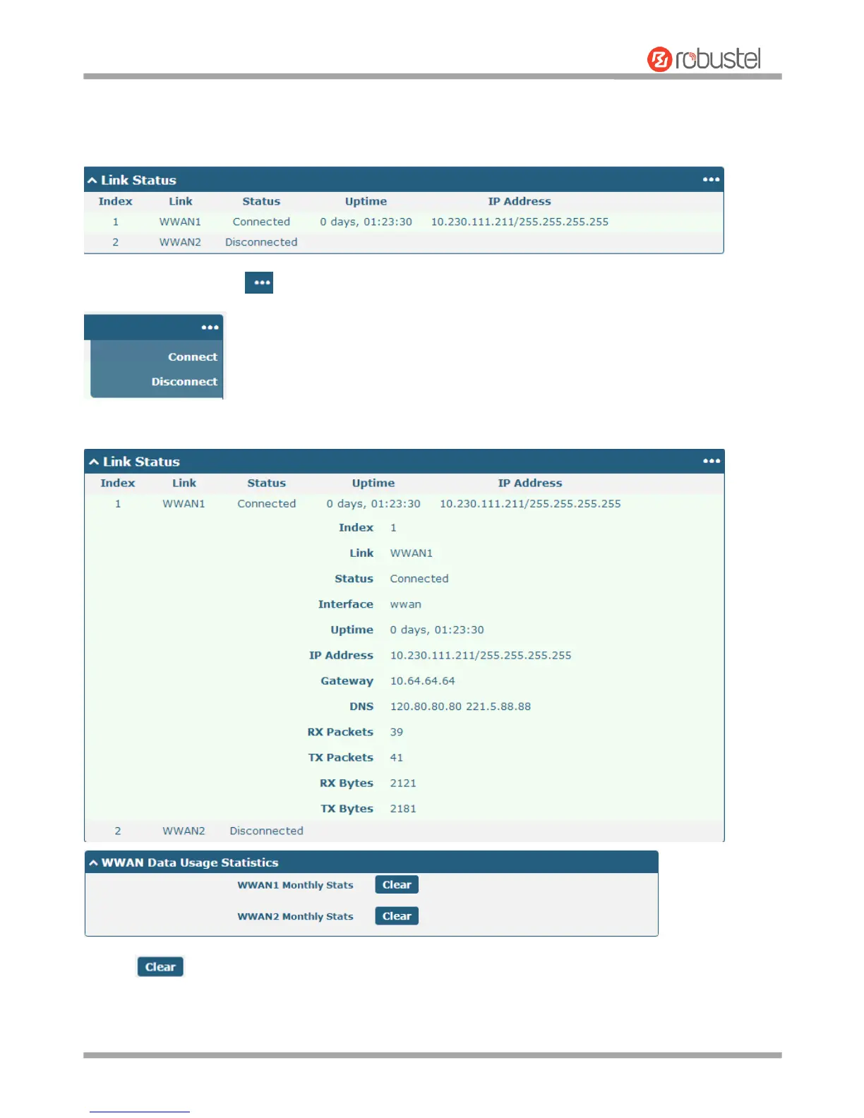 This page allows you to view the status of link connection and clear the monthly data usage statistics.