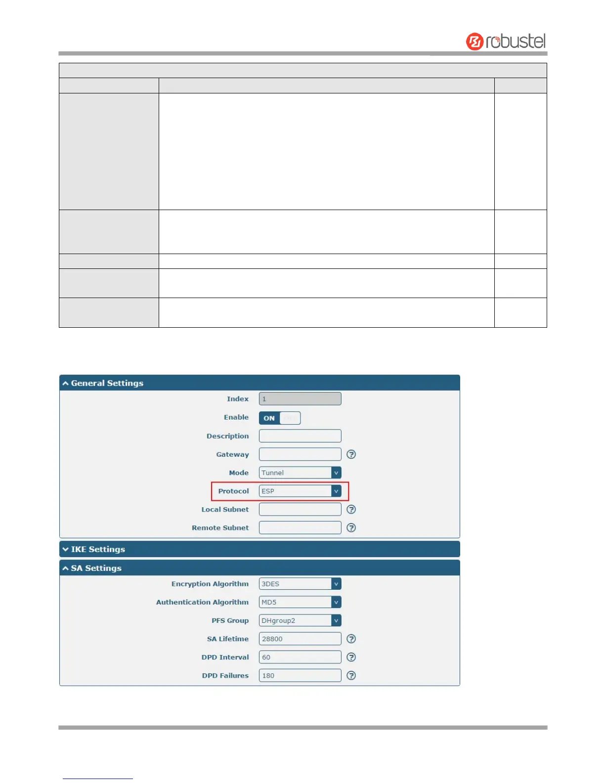 If click VPN > IPsec > Tunnel > General Settings, and choose ESP as protocol. The specific parameter configuration is