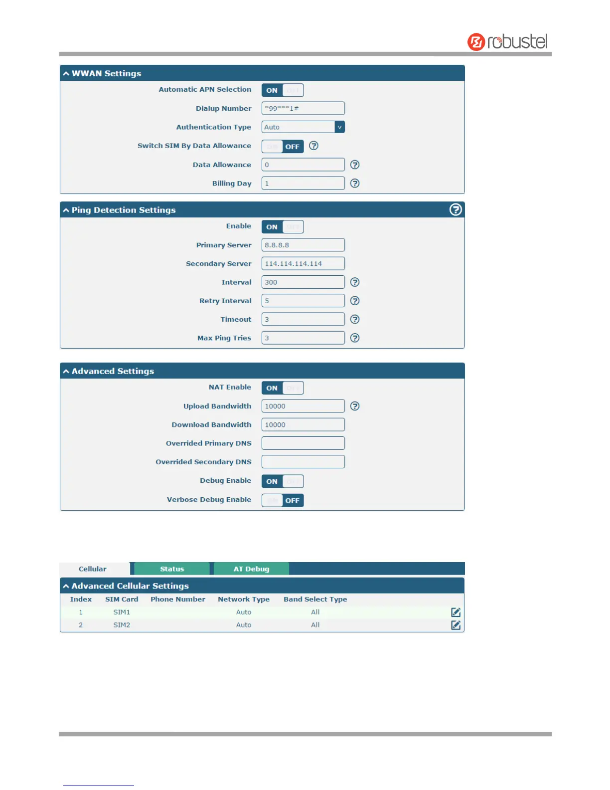 The window is displayed below by clicking Interface > Cellular > Advanced Cellular Settings.