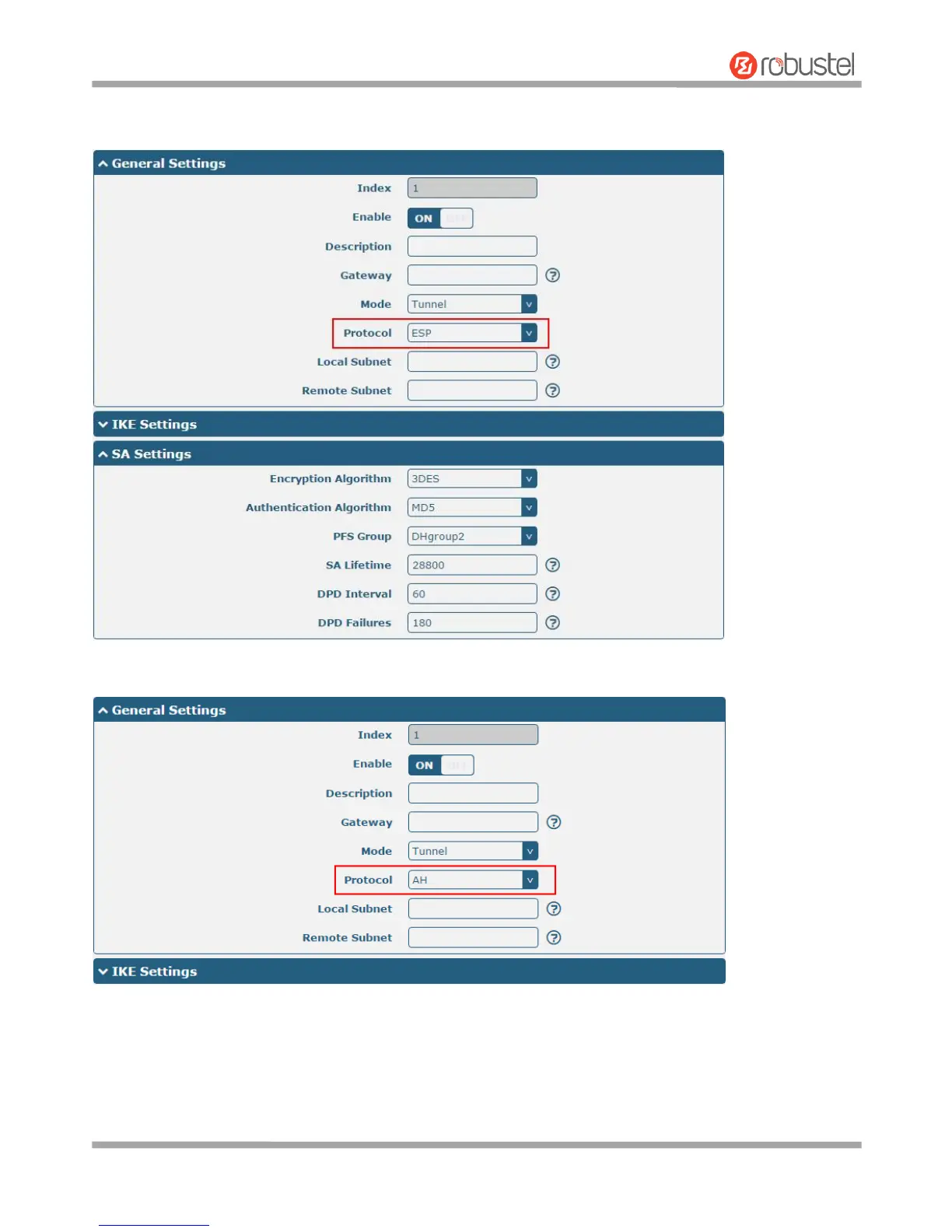If click VPN > IPsec > Tunnel > General Settings, and choose ESP as protocol. The specific parameter configuration is