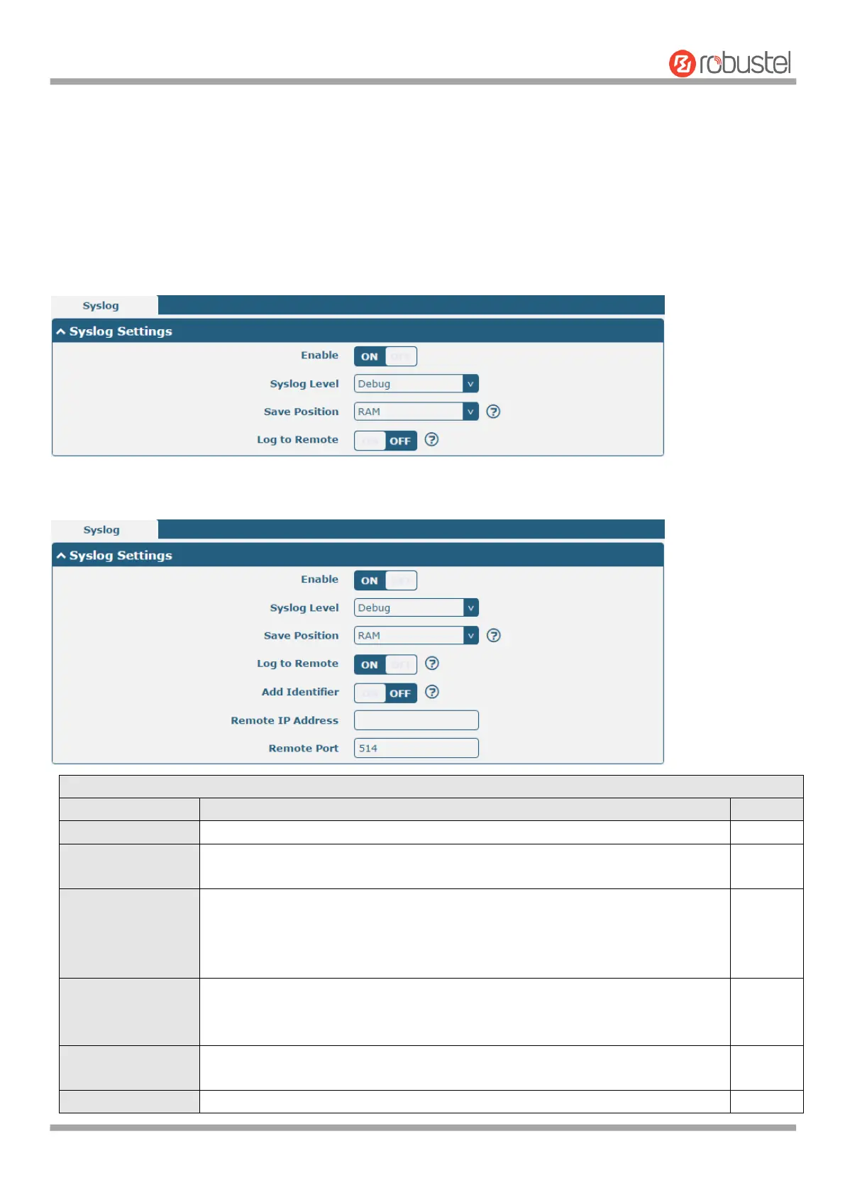 This section allows you to set the syslog parameters. And its "Log to Remote" is disabled by default. The system log