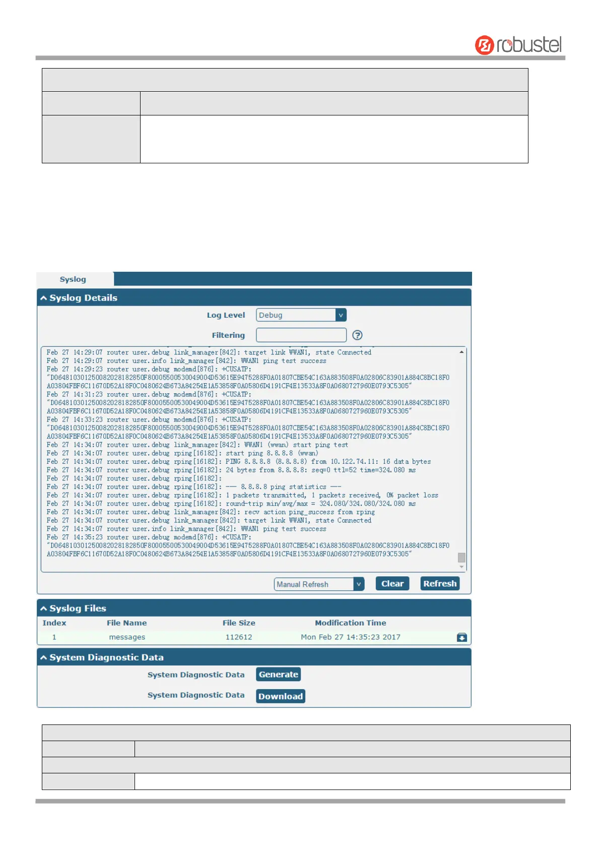 This section is used to view and generate the system operation logs and diagnostic data. Click Service > System Log >