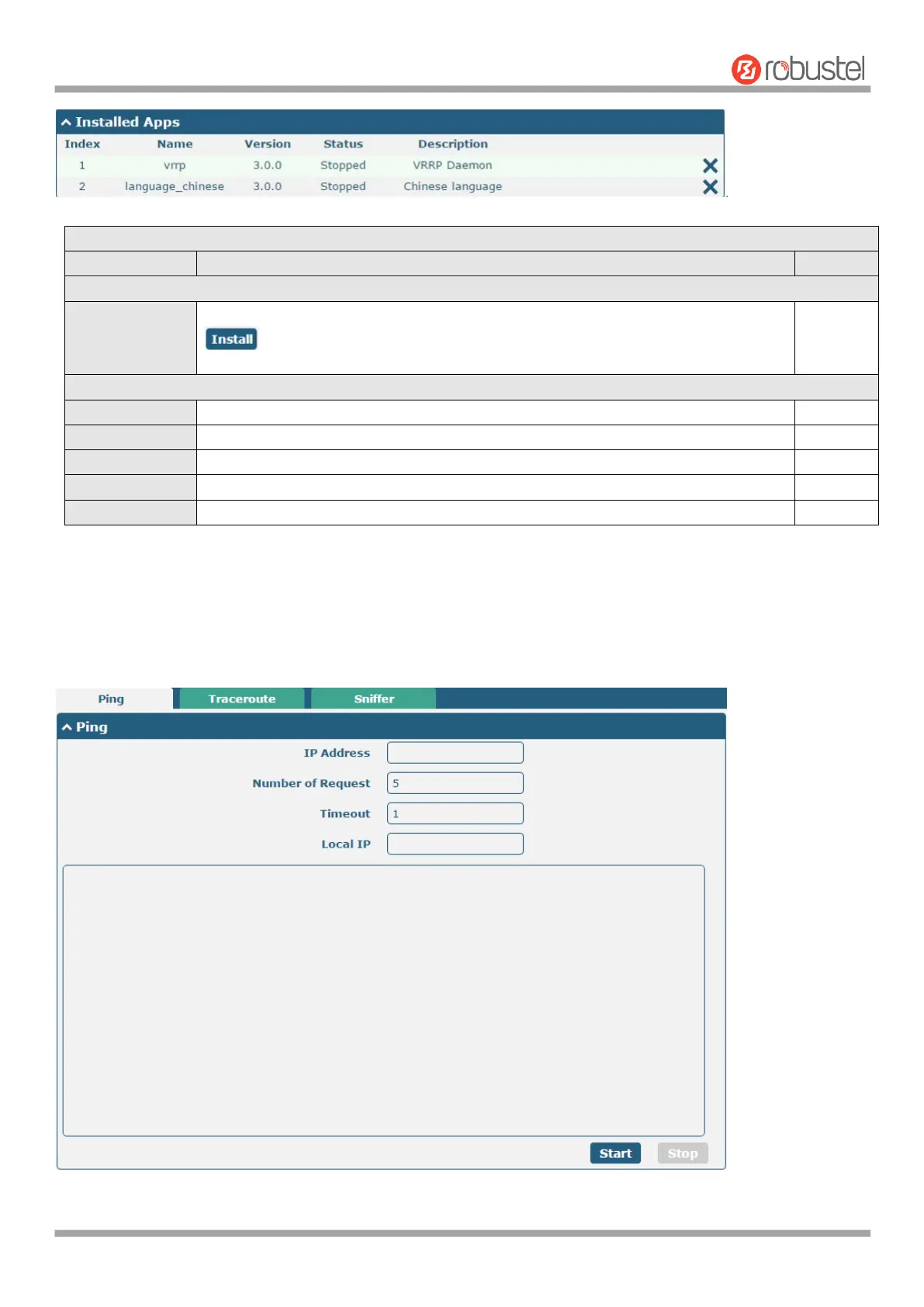 This section provides users three tools: Ping, Traceroute and Sniffer. The Ping tool is used to detect the network