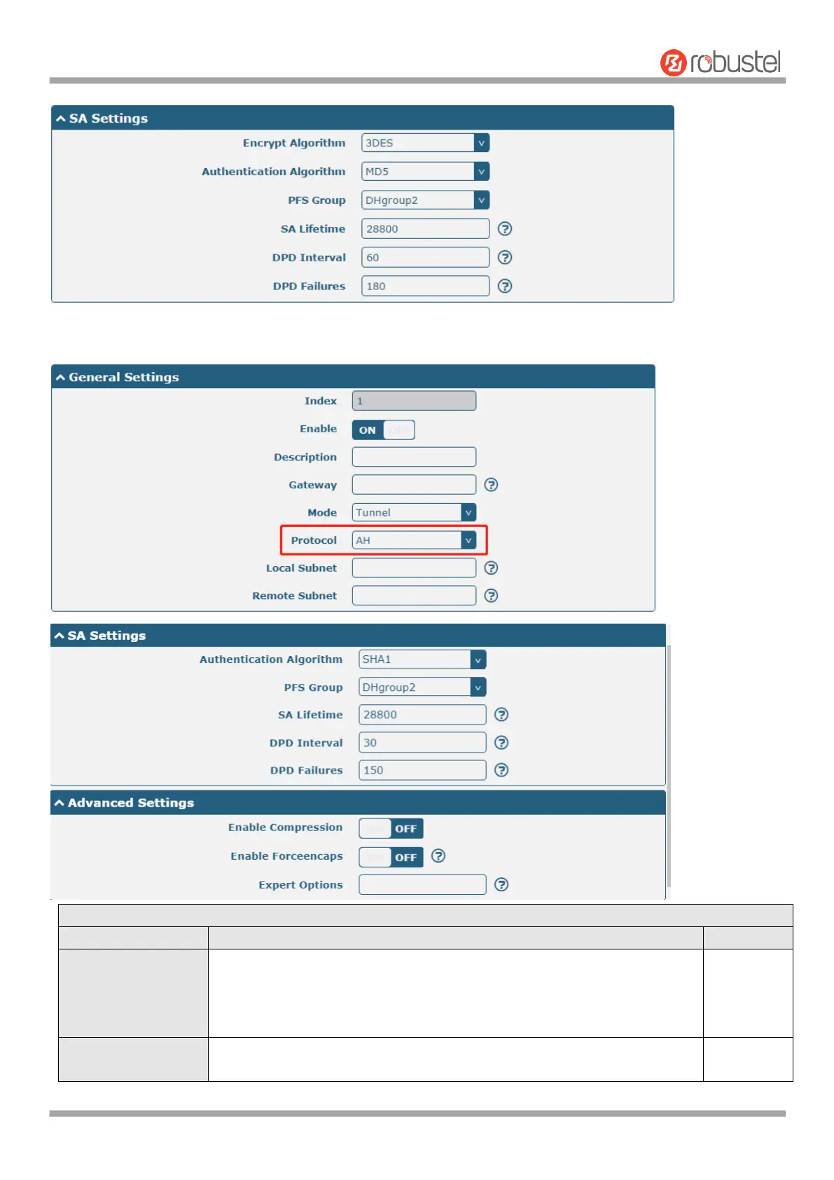 If choose AH as protocol, the window of SA Settings is displayed as below.