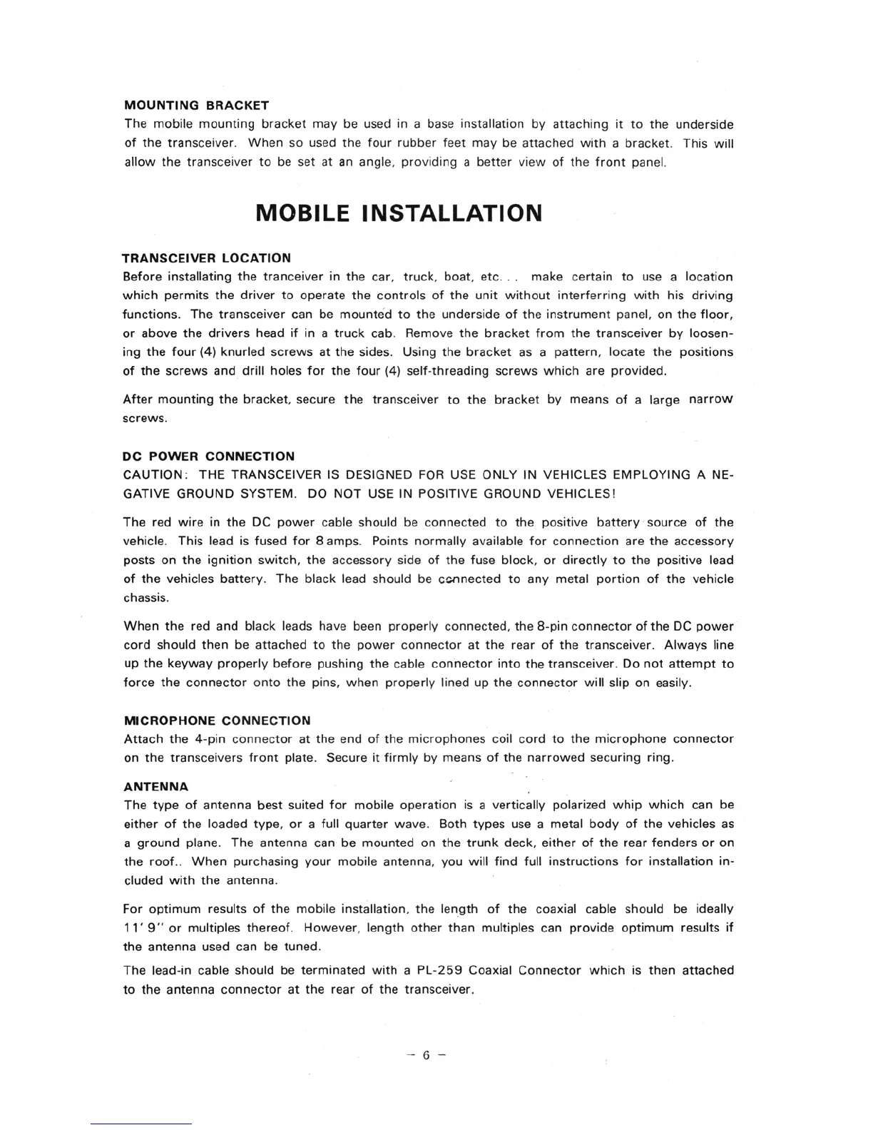 Robyn T-240D - Mobile Installation Guide; Transceiver Location and Mounting Bracket; Mobile DC Power Connection; Mobile Microphone and Antenna Setup