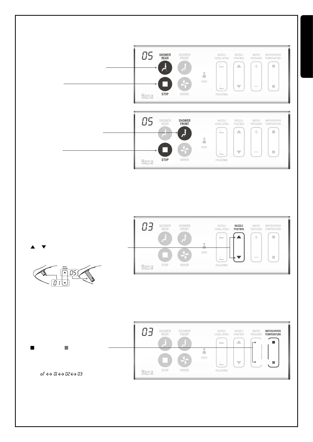 While the rear or font cleaning functions are activated, the following parameters may be adjusted. Nozzle postition, water temperature,