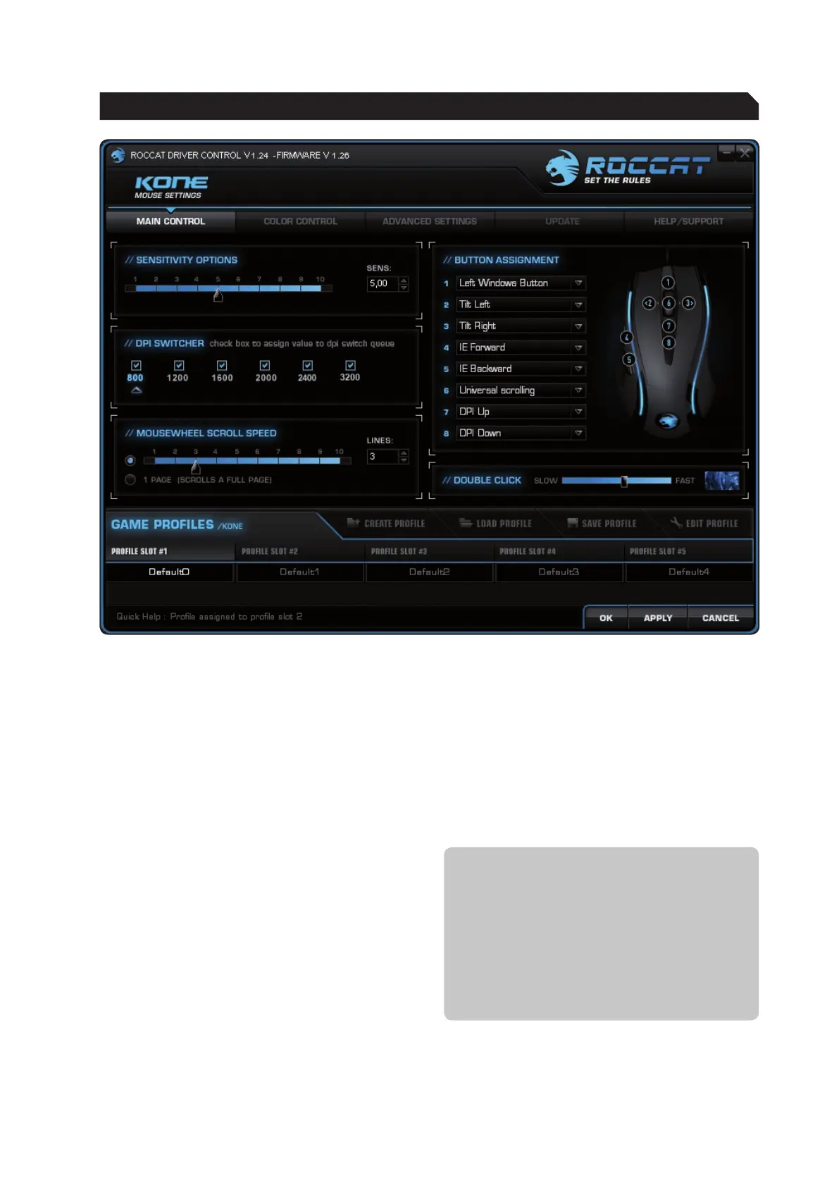 stored on just a single mouse button. 128kB of internal memory allows 5 Game Profiles to be stored on