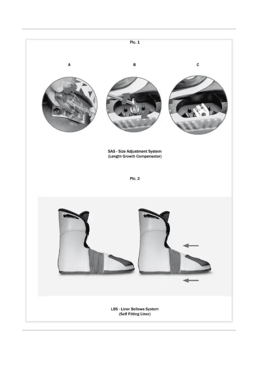 ROCES IDEA UP - Key Ski Boot Systems; SAS - Size Adjustment System; LBS - Liner Bellows System