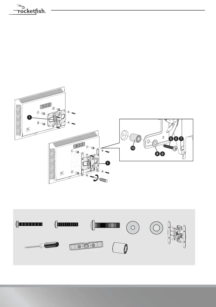 2Align the TV bracket (1) over the spacers (10), then place the washers (8 or 9)