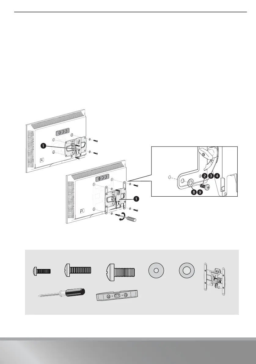 2 Place the washers (8 or 9) over the holes in the TV brackets that align with the