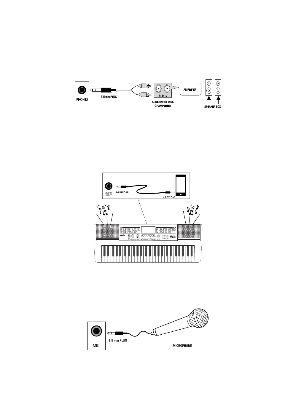 RockJam RJ640 - Connecting an Amplifier or Hi-Fi Equipment; Connecting a Phone or Audio Device to the aux Input to Play Music through the Keyboard; Connecting a Microphone