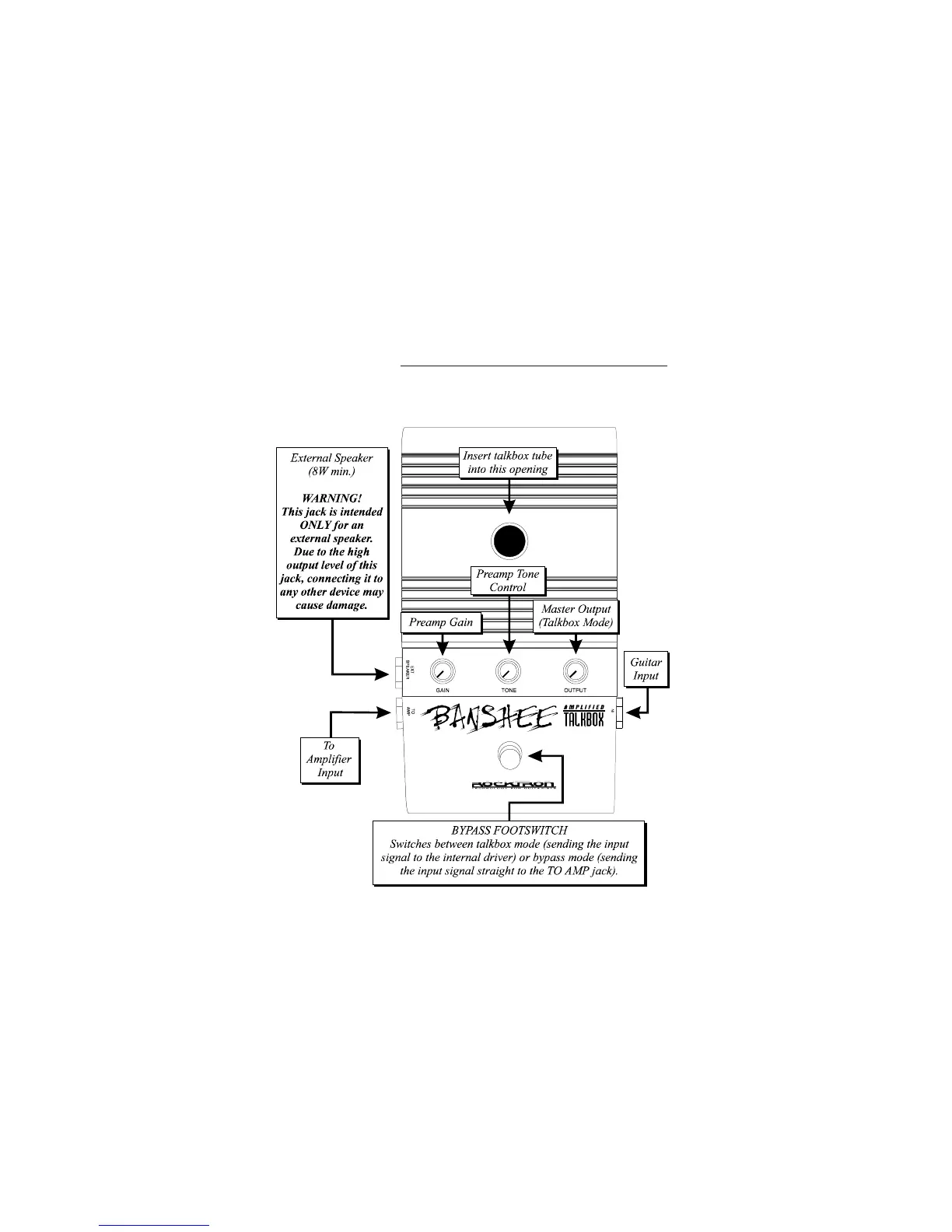 Rocktron BANSHEE - Product Functions and Controls; External Speaker Jack and Warning; Main Controls and Connections