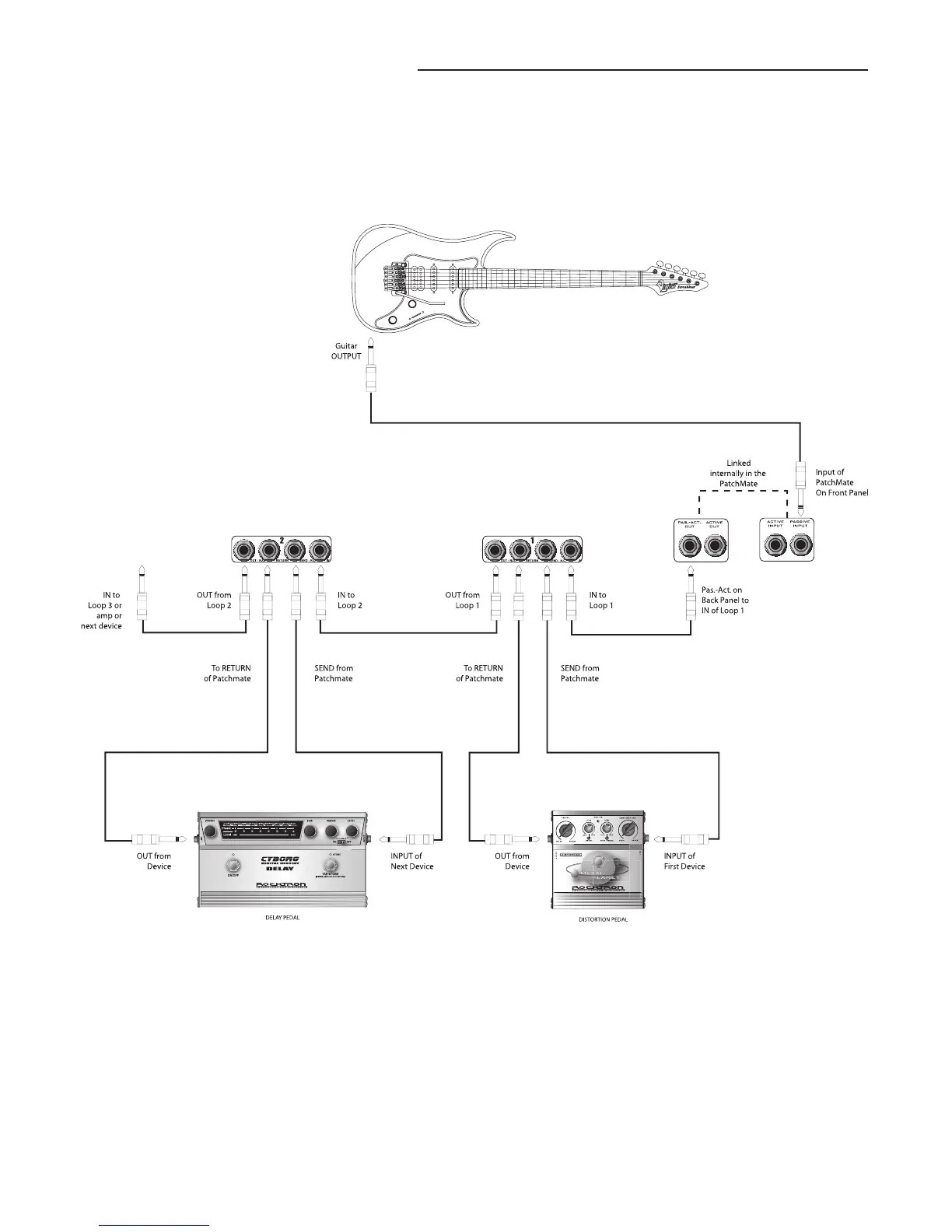 This connection diagram shows one way to use the LOOPs in the PatchMate to connect stompboxes