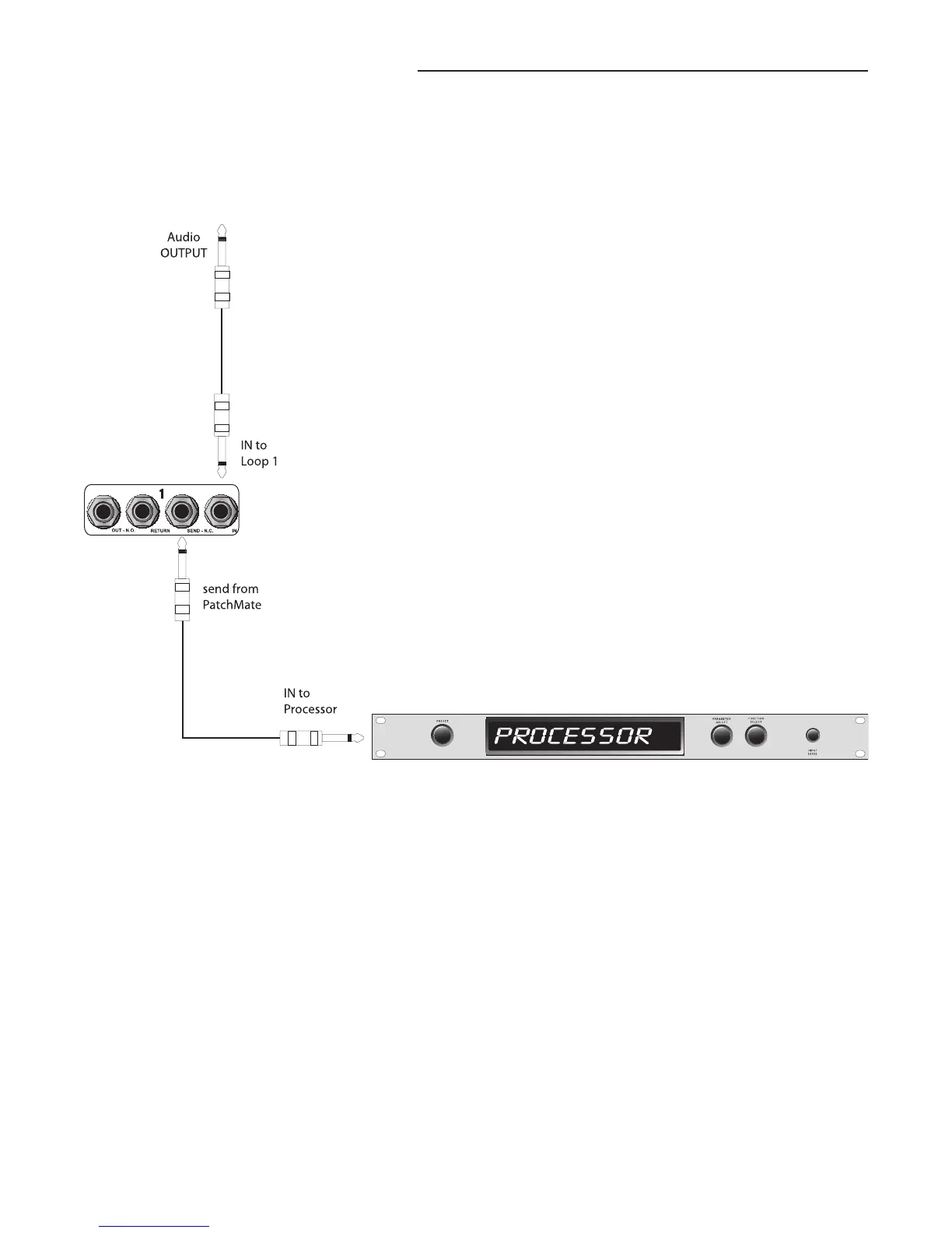 This connection diagram shows one way to connect the PatchMate to "MUTE" an effects processor