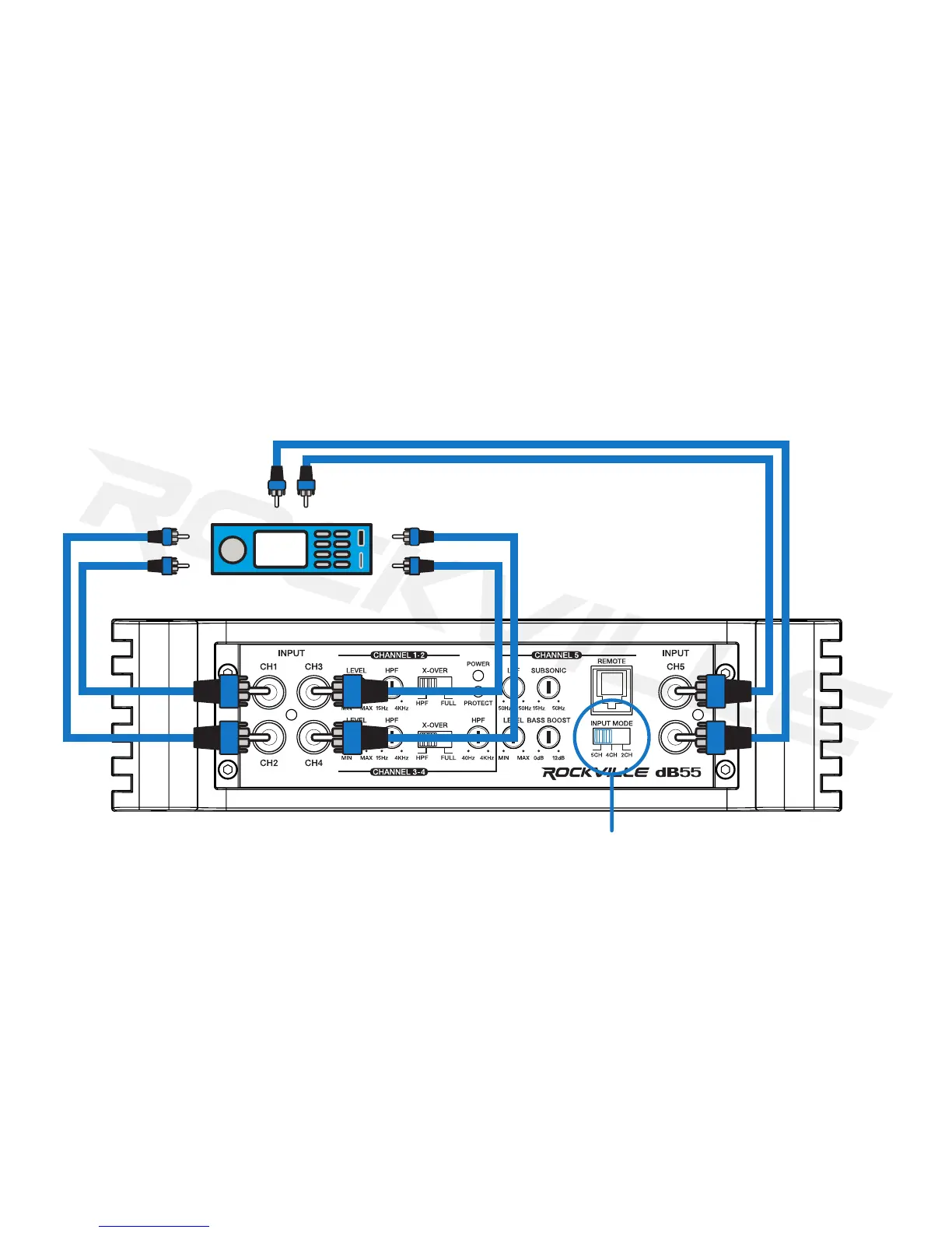Subwoofer output in to Channel 5. If your head unit has only a single subwoofer output, use a Y adaptor to feed both Channel 5 inputs. Set the Input Mode Switch to 5Ch. The ampliers preamp