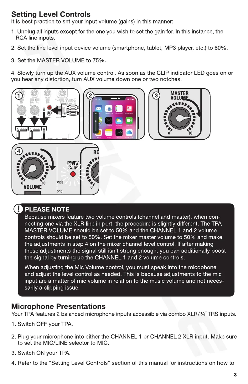 Rockville TITAN PORTABLE ARRAY - Setting Level Controls; Setting Input Volume (Gains); Microphone Presentations; Connecting and Setting Up Microphones