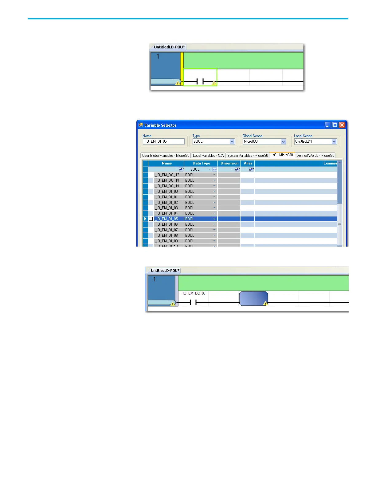 dialog. Click I/O Micro830 tab. Assign the Direct Contact to input 5 by selecting