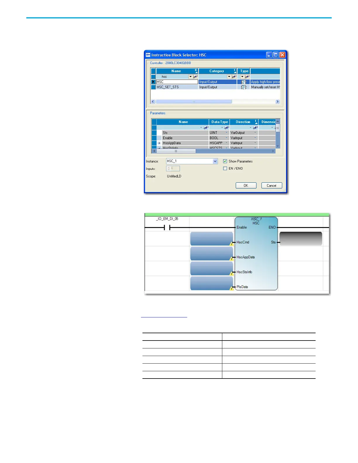 7. Double-click the function block to open up the Instruction Selector dialog. Choose HSC.