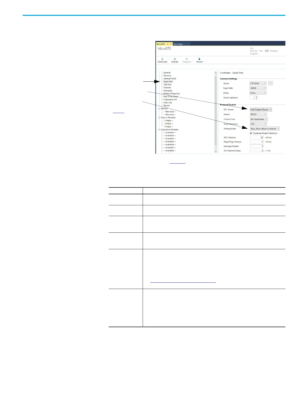 Define the parameters shown in Table 95 when configuring a Micro800 controller as a master