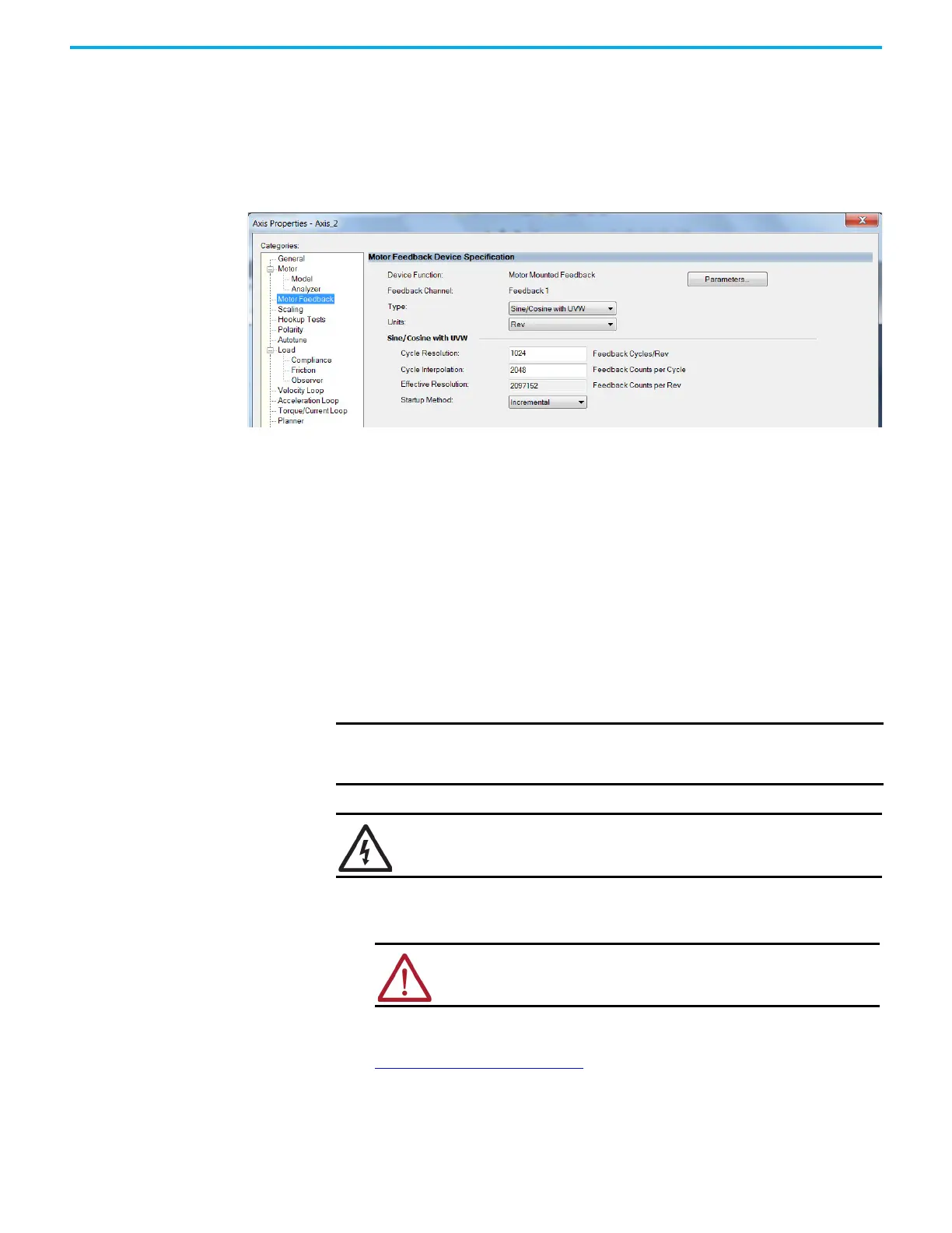 In this example, a motor feedback device is configured for Sine/Cosine with