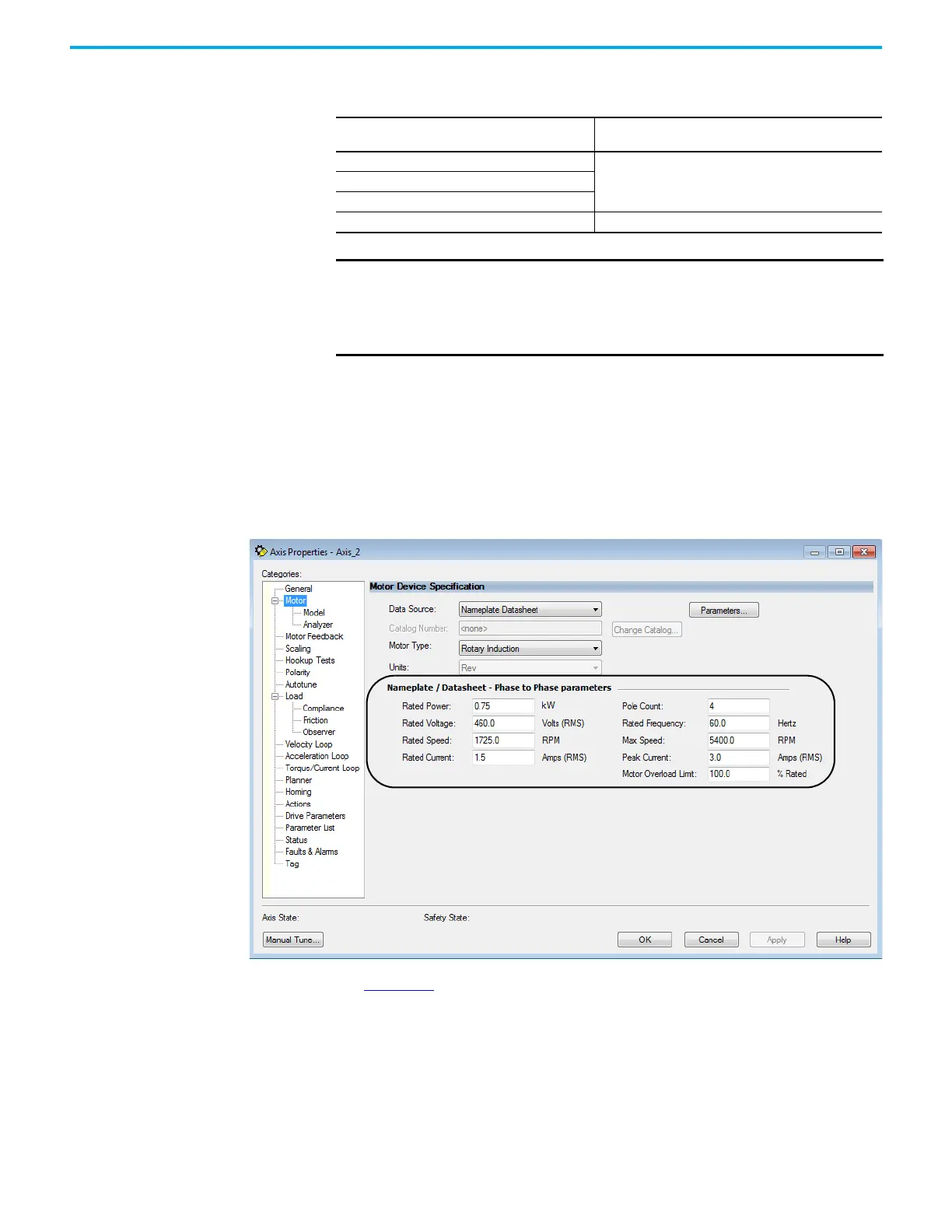 Motor Category From the Motor category you can enter motor nameplate or datasheet values