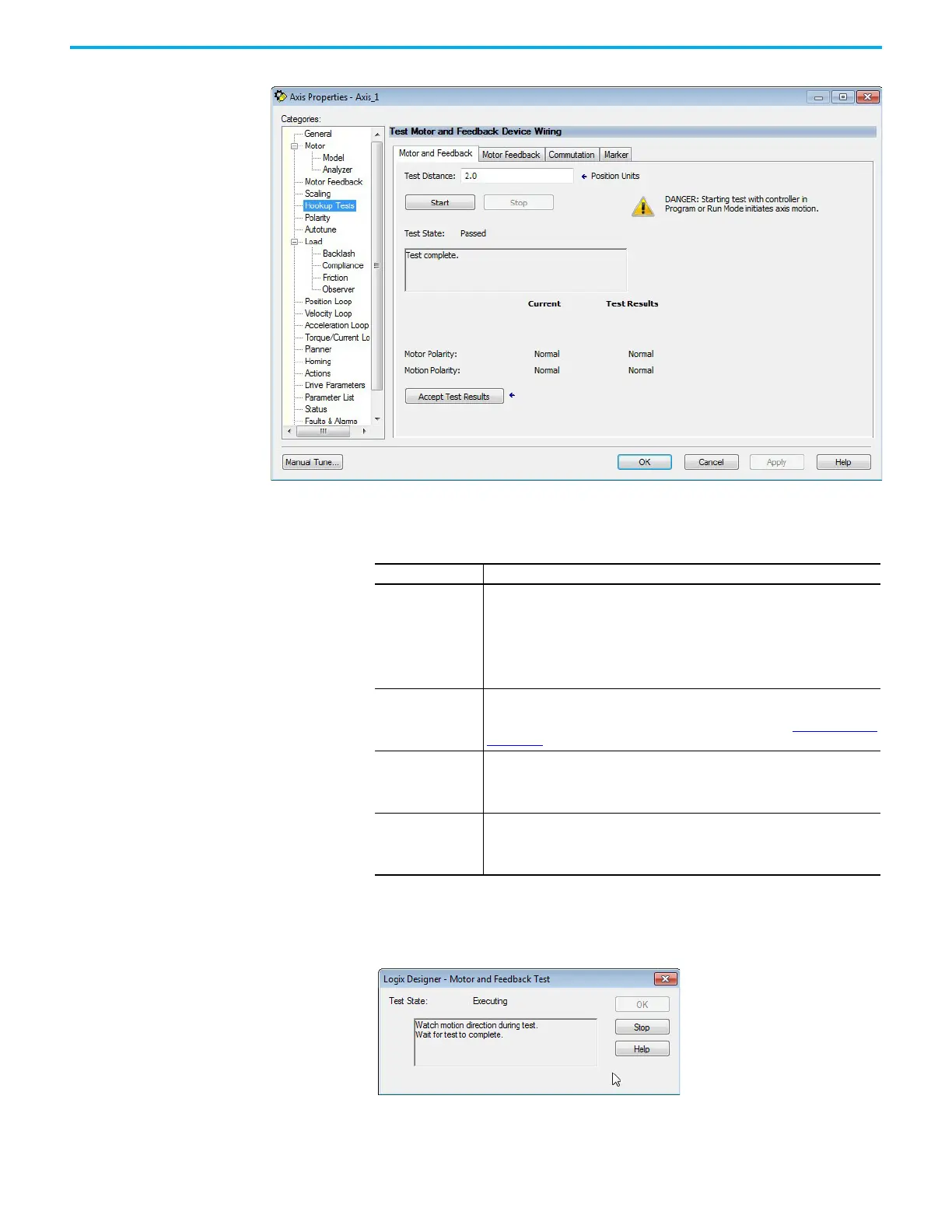 The Logix Designer - Motor and Feedback Test dialog box appears. The