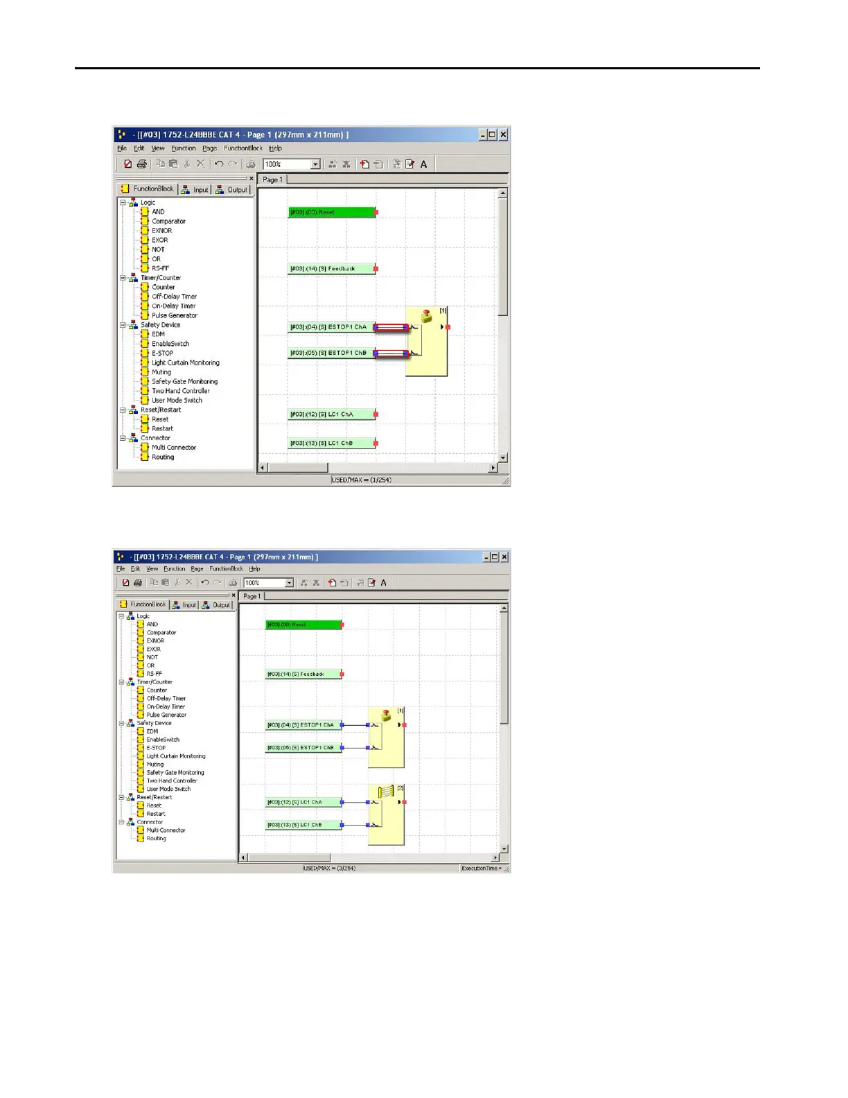 For this example, the Light Curtain Monitoring function block was also added and connected to the safety inputs.