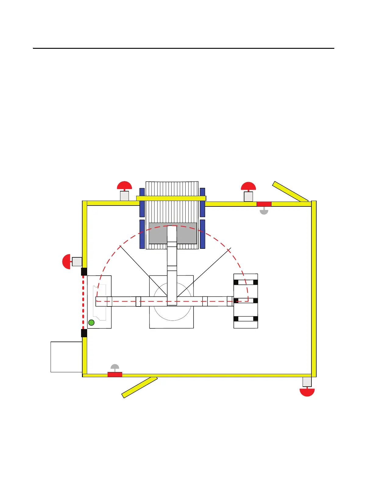 The safety zone in this example is comprised of these guarding devices (inputs): four E-stop buttons, two locking switch/