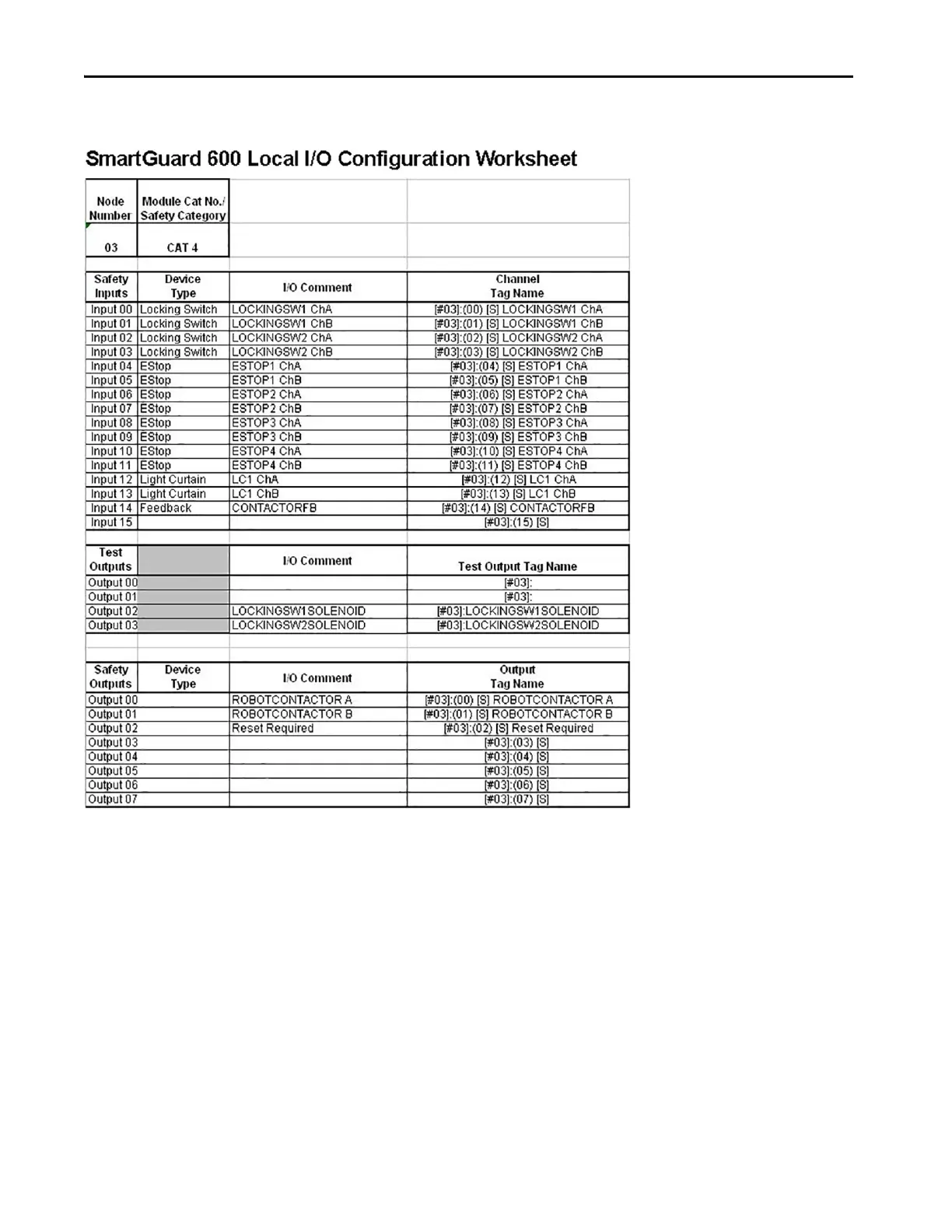 The completed worksheet for the SmartGuard 600 local I/O is shown below.