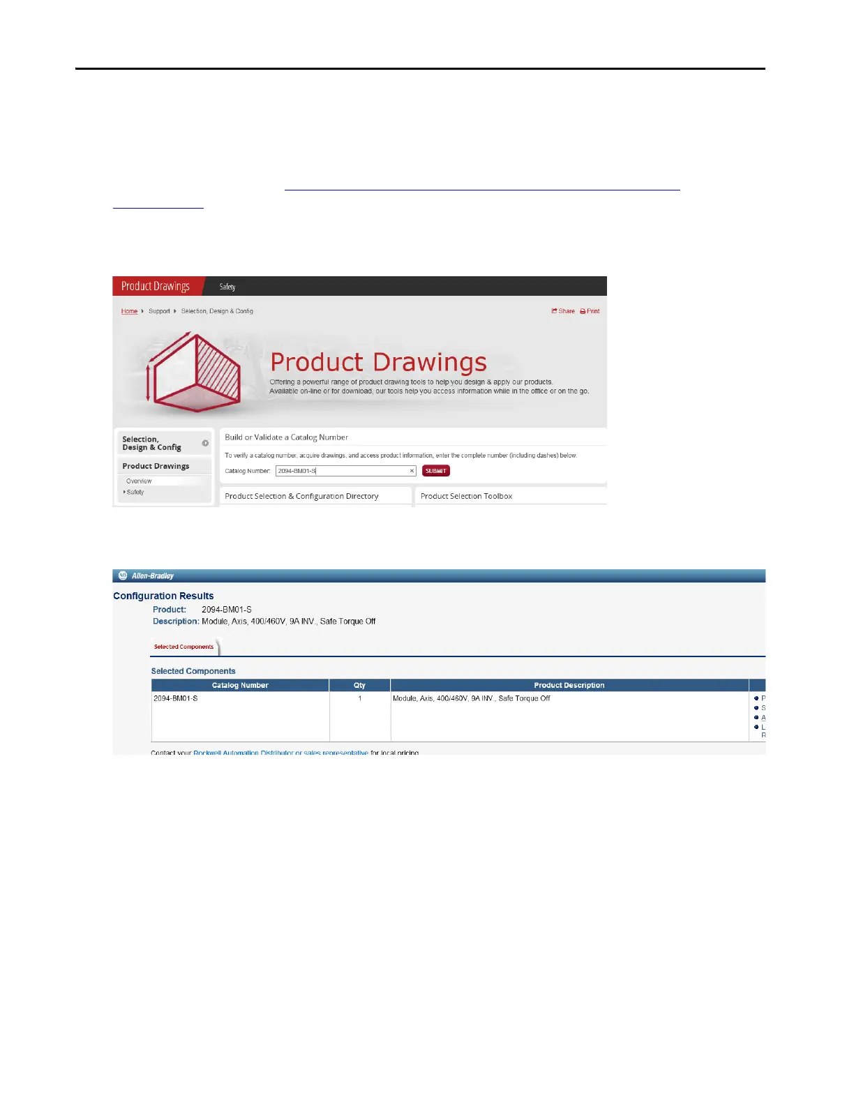 The Configuration Results window opens, showing what documents are available for that catalog number.