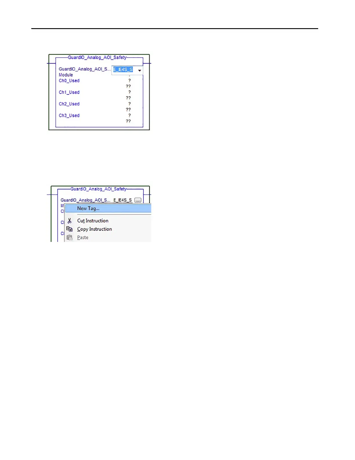 This example shows an Add-On Instruction named E_IE4S_S that is associated with a Analog Guard I/O module