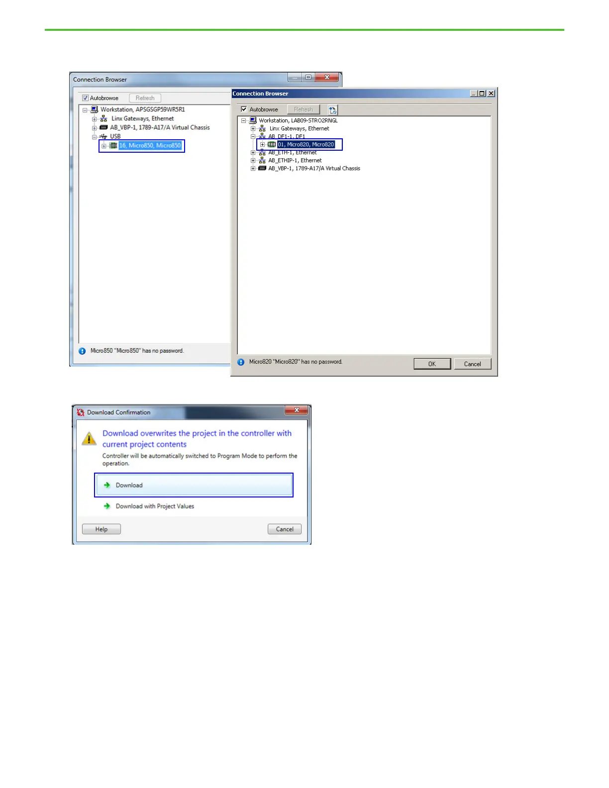 4. If there are no errors in your project, the Connection Browser dialog box appears. Browse for your Micro800 controller by expanding