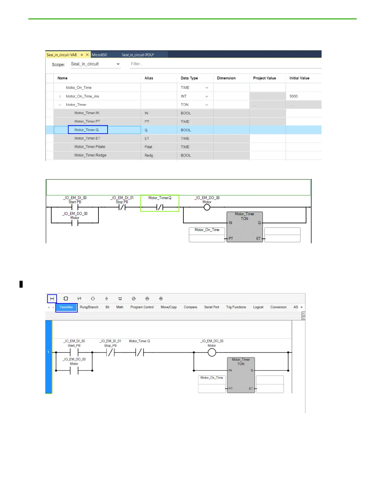 1. Locate the Rung instruction in the Favorites folder of the Instruction Toolbar. Click the instruction to add a rung below Rung 1.