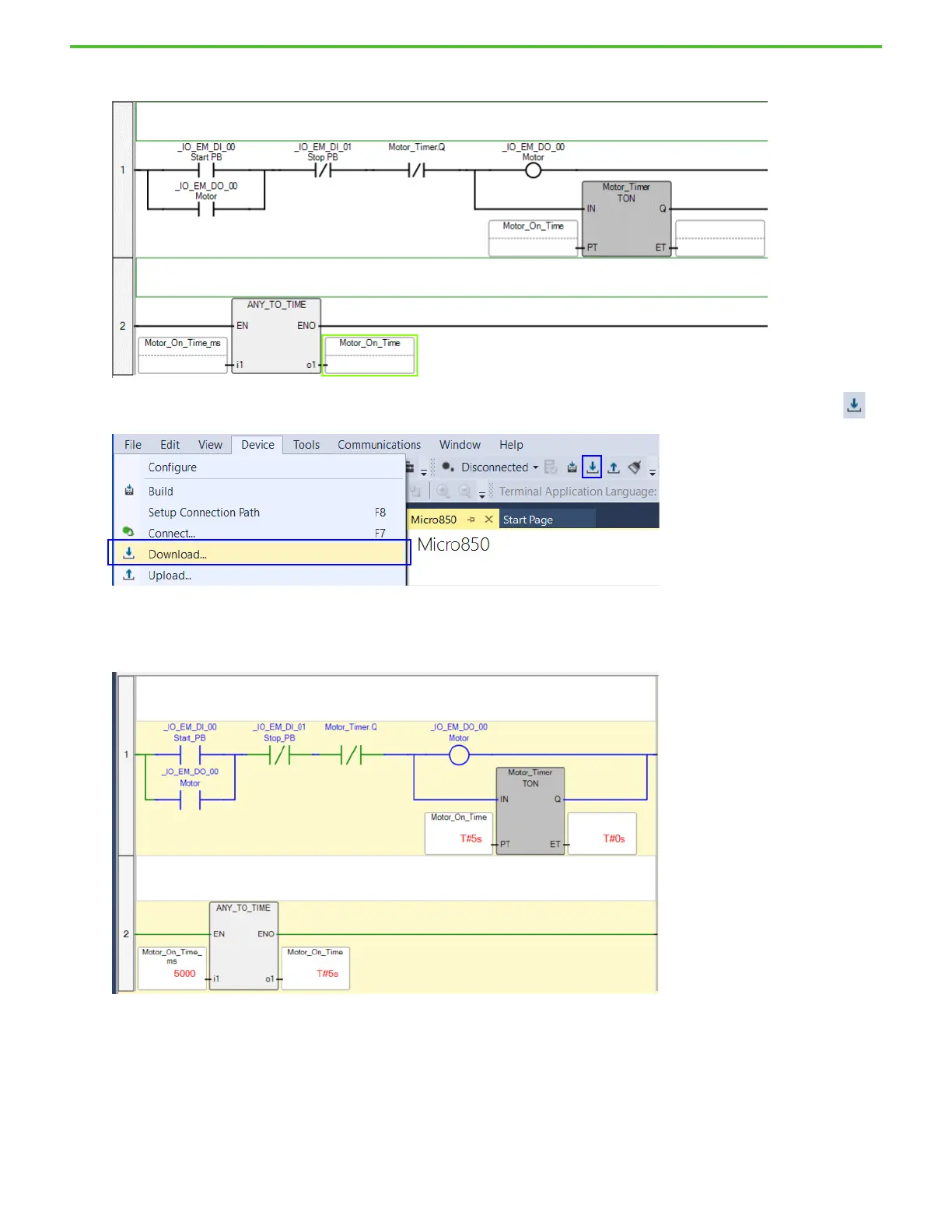 5. You can now download the program to the Micro800 controller. You can select Device > Download, or select the Download icon .