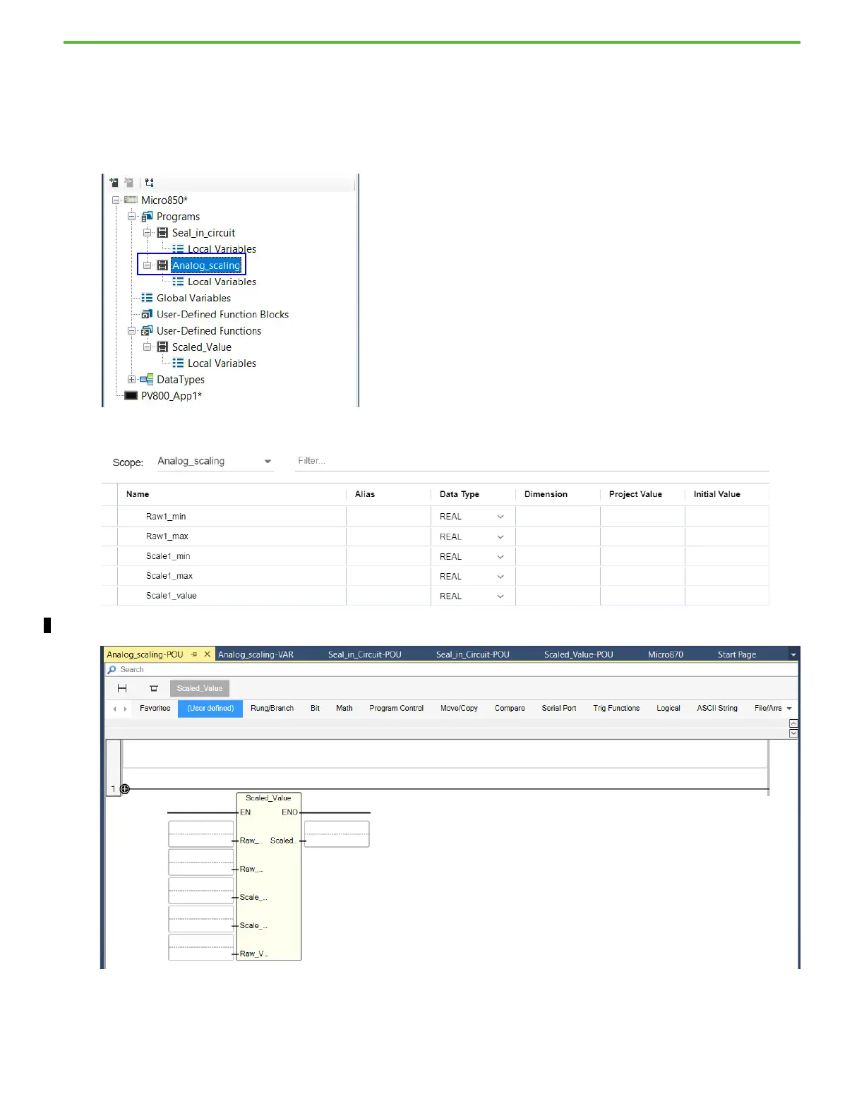 4. Next, open the Analog_scaling program. Drag-and-drop a Scaled_Value instruction from the (User defined) folder onto the first rung.