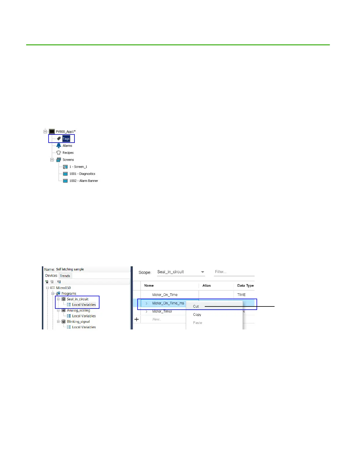 1. Go to the Local Variables for the Seal_in_circuit program. Right-click the Motor_On_Time_ms variable and select Cut.