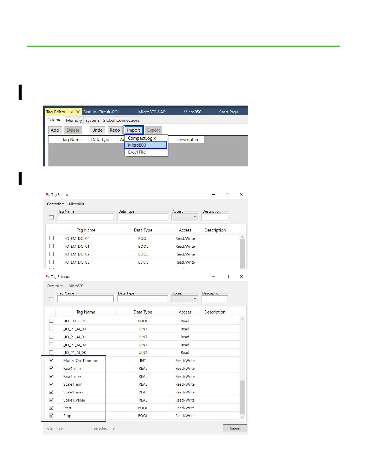 1. In the Tag Editor tab, select Import and select Micro800 from the dropdown menu.