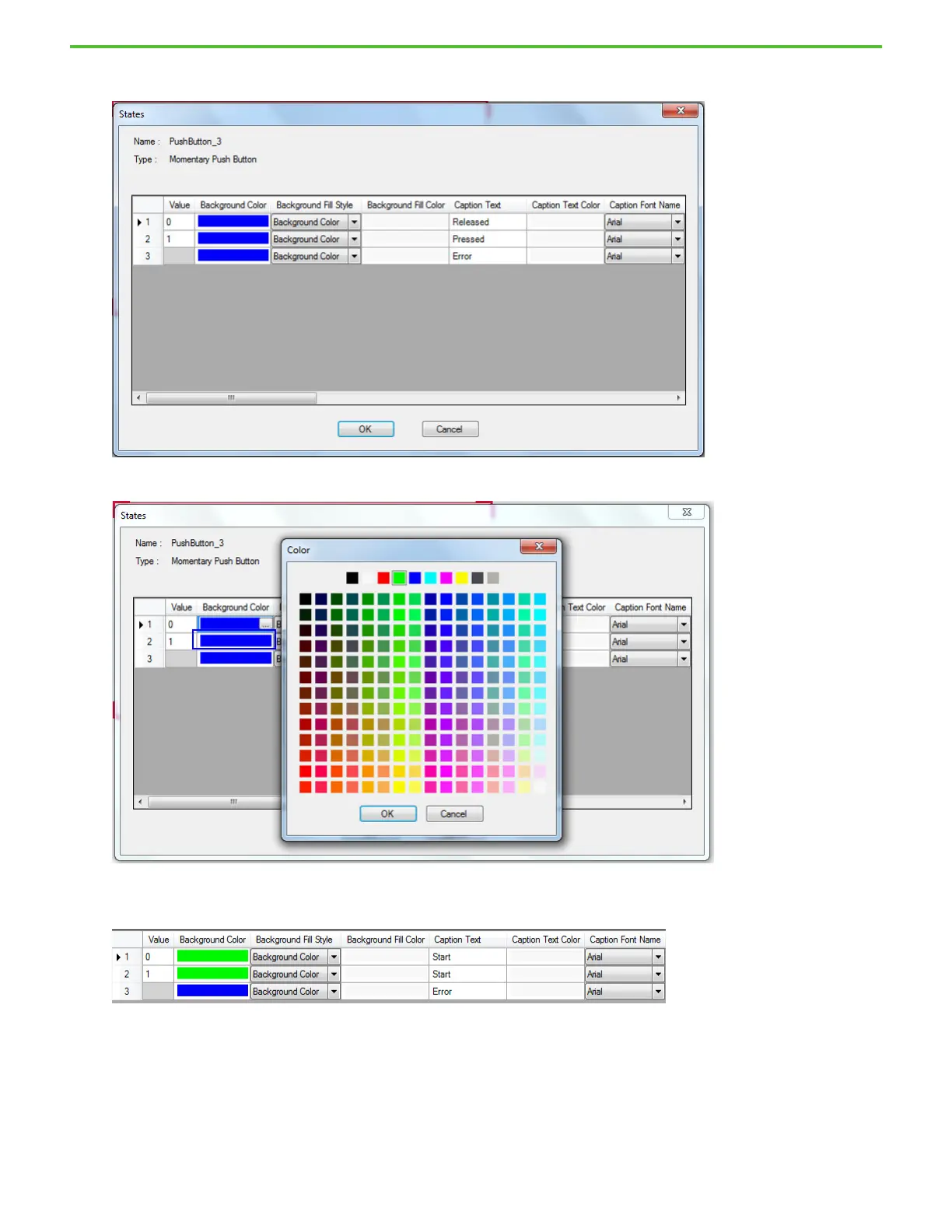 3. Under the Background Color column, select the ellipses to bring up the Color selector, and change the color of State 1 to green.