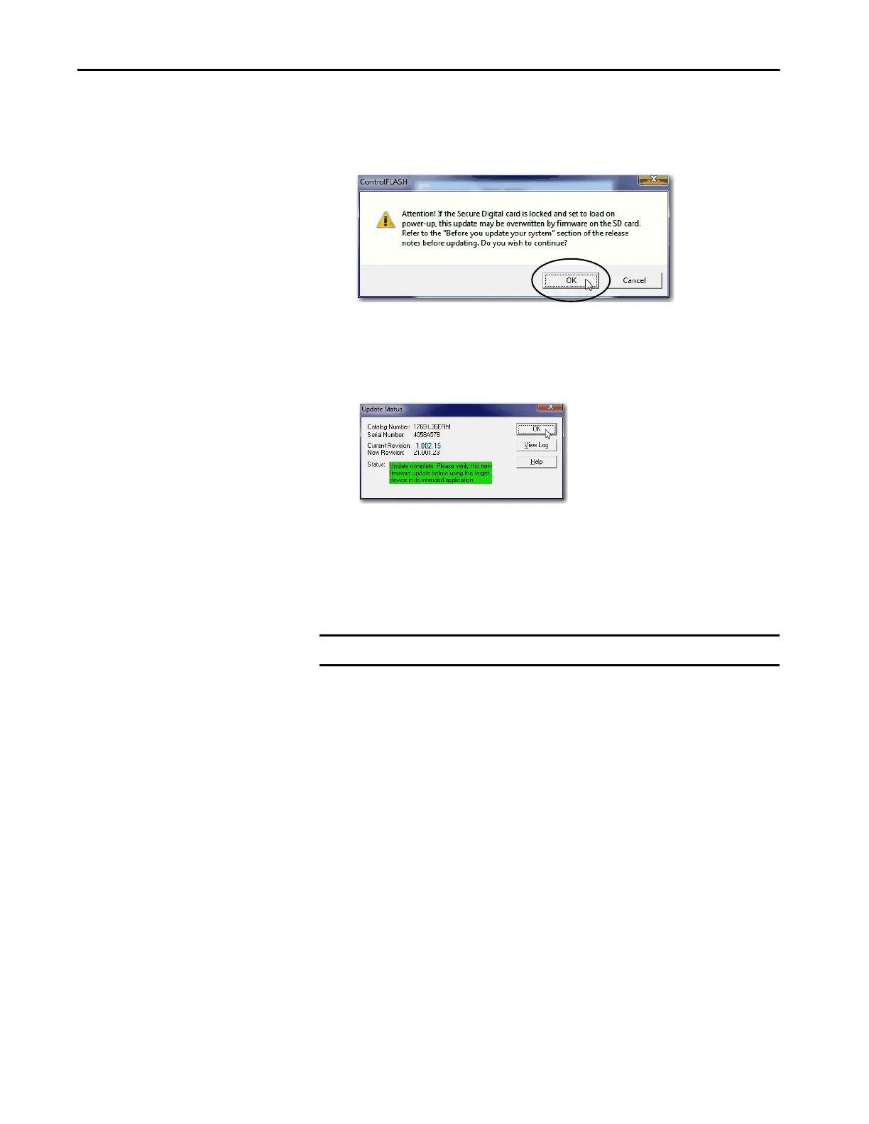 After the controller is updated, the status dialog box displays the